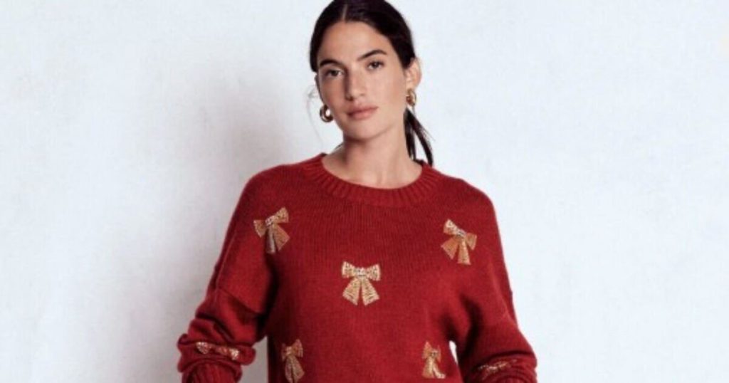 The Natalie Embroidered Jumper is currently priced at £129 – with the option for 15% off with the code RHDT at checkout, making it £109.65. It’s available in three colours, including a striking red with embellished bows, emerald green featuring bouquets or chestnut melange, cherry dotted with contrasting cherries.