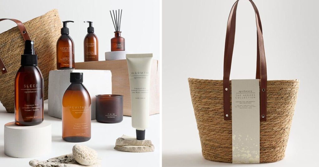 Inside, you can find seven products from the retailer’s own Apothecary range, all packed in a woven tote bag with leather-look straps that are stylish enough to use on their own.