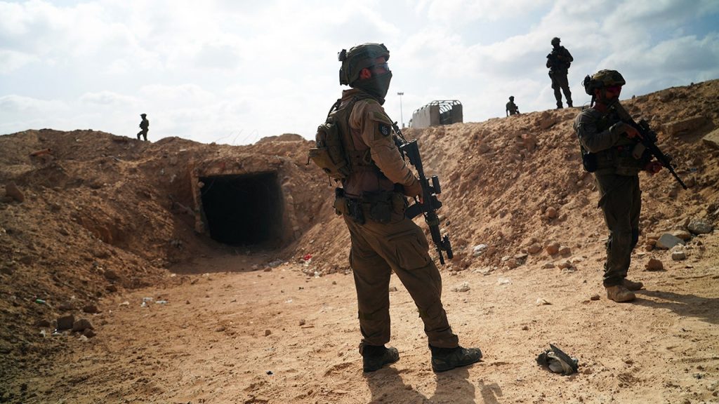 Israeli soldiers stand at the entrance of a tunnel in Rafah in the Gaza Strip on Sept. 13, 2024, amid the war between Israel and Palestinian militant groups. (Sharon Aronowicz/AFP via Getty Images)