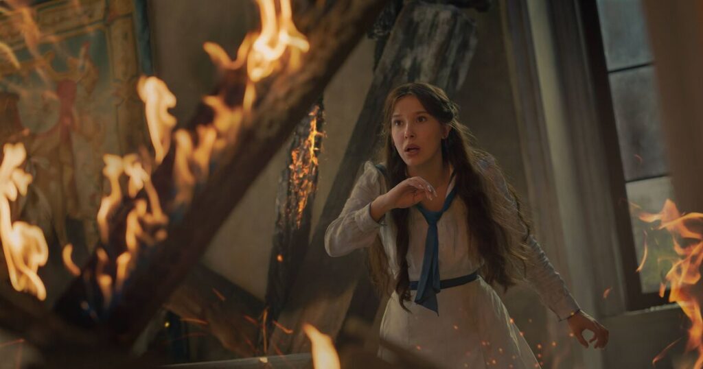 Fresh images from the film unveiled depict a sunlit new setting, Enola managing her prospective marriage to Lord Tewkesbury and being compelled to flee a lethal-looking blaze. Nevertheless, one photograph of Enola dressed in what appears to be a wedding gown has captured the interest of numerous fans.