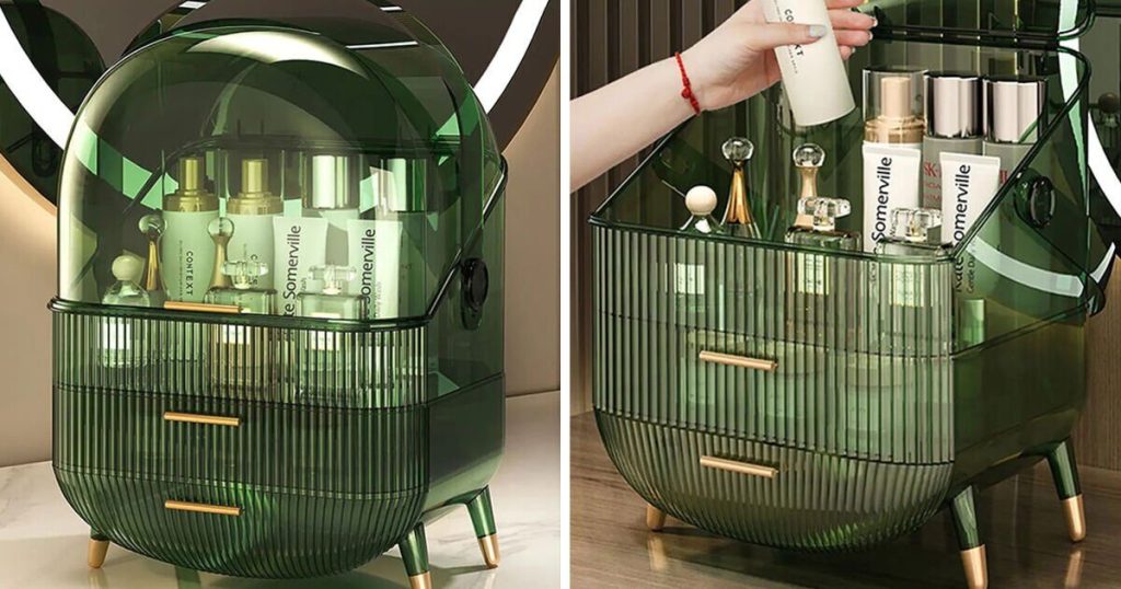 The container comes in emerald green with gold detailing and is made from plastic and acrylic, which, according to Debenhams, is claimed to be scratch-resistant. The cover also fully closes, which can help keep everything inside dust-free. Plus, there is a handle for carrying. It also has little legs, allowing it to stand on any surface, from dressing tables to bathroom floors.