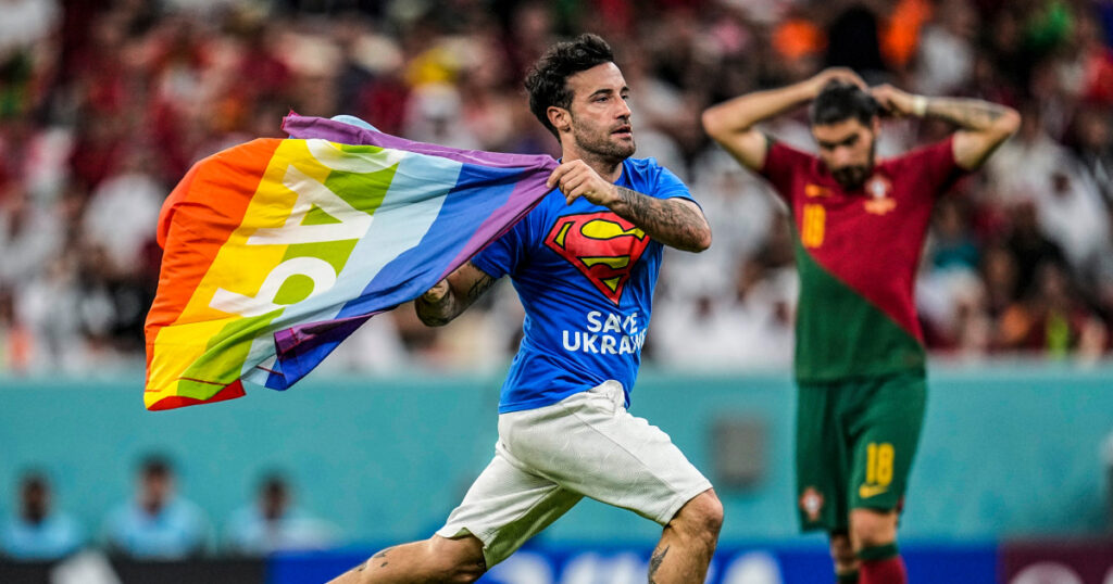 A protester ran onto the field Monday carrying a rainbow flag and wearing a blue Superman T-shirt that said “SAVE UKRAINE” on the front and “RESPECT FOR IRANIAN WOMAN” on the back during a World Cup match between Portugal and Uruguay.