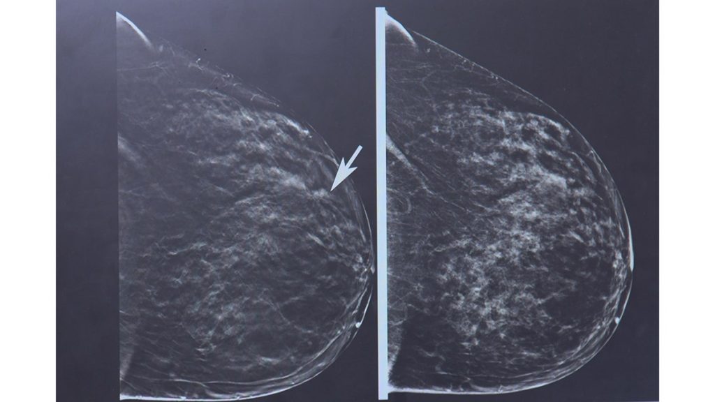 This is how lobular breast cancer can appear on a mammogram. Arya Roy, M.D., noted the cloudiness in the imaging, which would prompt her to recommend additional scans. (The Ohio State University)