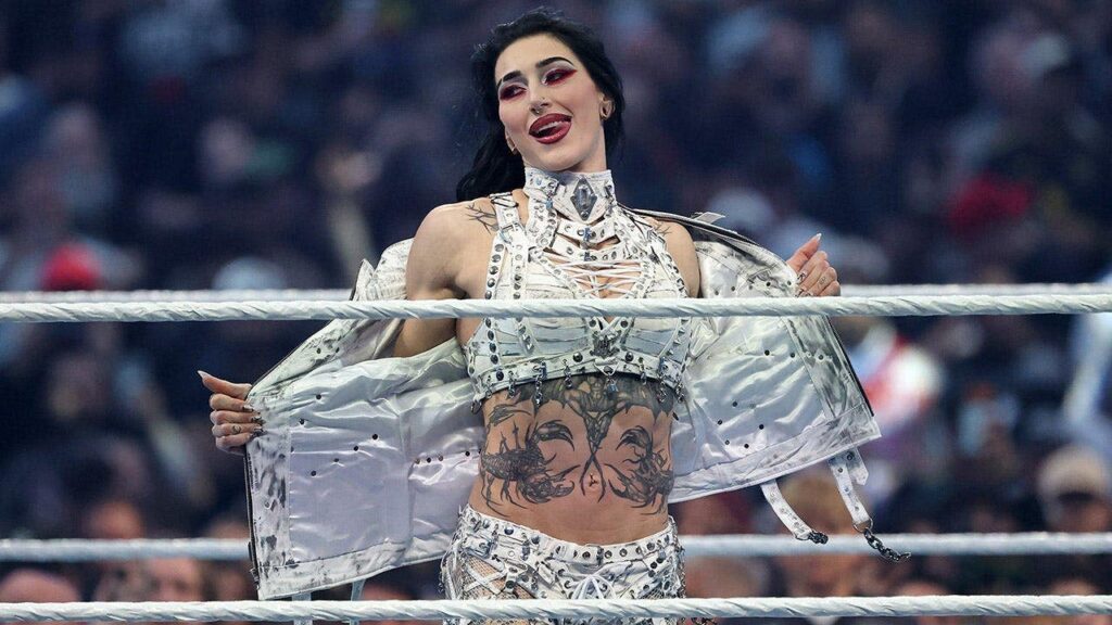 Rhea Ripley is introduced before the WWE Women’s Championship match against Jade Cargill during WrestleMania 42 at Allegiant Stadium in Las Vegas on April 19, 2026. (Ethan Miller/Getty Images)